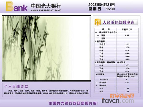 星際在長期“企業(yè)-客戶”互動營銷服務(wù)研究的基礎(chǔ)上,采取先進(jìn)技術(shù),結(jié)合銀行業(yè)務(wù)特點推出“總部集中管理制作,網(wǎng)點即時信息發(fā)布”的星際56IQ銀行多媒體信息發(fā)布系統(tǒng),幫助銀行構(gòu)建基于液晶/等離子平板電視、LED等數(shù)字多媒體的統(tǒng)一業(yè)務(wù)互動營銷管理平臺。系統(tǒng)提供基準(zhǔn)利率、外匯、基金、天氣、時間等動態(tài)組件,實現(xiàn)后臺數(shù)據(jù)庫實時聯(lián)接,實時播放基準(zhǔn)利率、基金、外匯等金融數(shù)據(jù)信息及業(yè)務(wù)宣傳信息與歡迎信息等。