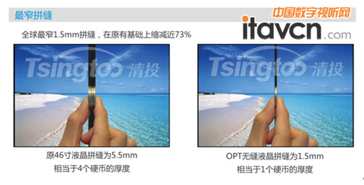 中國大屏幕拼接行業近期殺出的一匹黑馬——清投OPT無縫液晶拼接,以1.5mm的拼縫優勢,引起了行業轟動,受到了業內許多廠家、客戶、媒體的強烈關注。說到OPT無縫液晶拼接大屏,當然不能脫離它在畫質顯示方面的突出優勢而單純地來介紹。清投OPT無縫液晶繼承了原有液晶拼接產品的所有優勢,在此基礎上通過OPT光學國家專利技術,將拼縫降至業內最低,這一革命性的提升恰巧為它帶來了更多方面的優勢。