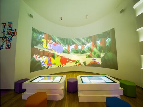 進(jìn)了童話動(dòng)物園,孩子可以在這里親切感受大自然的神奇。由3臺(tái)NEC P502HL+激光工程投影機(jī)完美融合打造的弧幕,為小朋友們提供出一個(gè)五彩斑斕的童話世界。在童話王國(guó),孩子們可以借助科技畫筆,為小動(dòng)物換上新裝,涂上自己喜歡的色彩,超萌超可愛的小動(dòng)物就展現(xiàn)在孩子們面前了。能有這樣的效果,NEC P502HL+功不可沒,1920*1080全高清分辨率能夠帶來(lái)完美、細(xì)膩的畫面顯示,加之其搭載的激光光源,呈現(xiàn)出來(lái)的色域范圍更廣,能夠?qū)崿F(xiàn)絢麗多彩的圖像,令動(dòng)物世界更逼真、生動(dòng)。孩子們沉浸其中,一定會(huì)戀戀不舍,一直拉著爸爸媽媽跟小動(dòng)物們玩得很嗨!