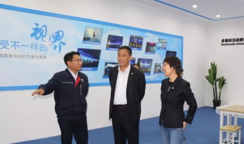 來訪領導先后參觀國畫激光投影機生產線、國畫激光投影展廳,現場了解了國畫激光投影業務的運營情況和產品體驗,并對國畫產品線開發和新業務模式拓展提出了指導意見。