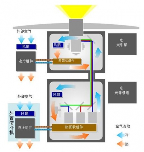 特別值得一提的是,NC1700L+作為NEC雙色激光放映機系列的一員,沿襲了NEC獨家雙腔體防塵CCT內循環冷卻結構,實現了極致防塵和高效散熱的雙重功效。防塵方面,采用光源內置一體化設計,內循環冷卻結構將光引擎和光源分別完全密封在各自的腔體中,密封腔體內外空氣不接觸,使得機器外部的灰塵無法進入到機器內部對光學元器件造成污染,從而有效地降低因灰塵堆積造成的光學元器件的污染和高溫損害。散熱方式上,通過熱回收組件和液冷組件之間的液體循環將熱量帶出密封腔體,加之外部冷空氣在風扇的帶動下為液冷組件散熱,從而降低了機器內部的熱量堆積。而且兩個腔體各自獨立散熱,極大地提升了散熱效率。