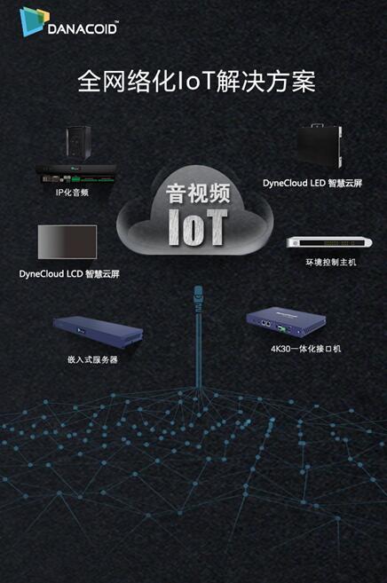 大因音視頻IoT理念打造的全新音視頻IP化解決方案,使用一根網線解決音視頻的供電、傳輸、管理和控制。有了大因的音視頻IoT,整個方案即可實現音視頻的供電、傳輸、管理、控 制,取代了傳統音頻所需的音頻線、控制線。依托于DyneCloud系統,所有音視頻信號實現互聯互通、無縫交互、信息共享、 多屏聯動,一鍵切換,同步操作。這套解決方案顛覆了傳統的堆砌音視頻設備的音視頻系統,使設備極簡化,減少出現故障的頻 率,從而實現了系統的“至繁歸于至簡”。目前,DANACOID的音視頻 IoT已經在智慧學校、企業辦公、指揮中心、商業應用、政府會議等方面得到了廣泛應用。