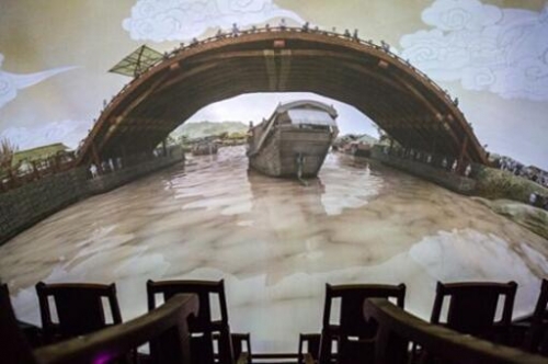 《清明上河圖3.0》展演獨創性地呈現了北宋的人文生活圖景,孫羊店沉浸劇場首次將北宋的氣息、光影、樂曲······在360度的全息立體空間中還原,窗外有流動的街市風物,宋人茶余飯后的閑談吟唱環繞耳畔。漫步過充滿驚喜的春天雨巷后,觀眾還可以在4D動感的虹橋球幕影院“坐”上一條大船,任河水劃過腳下,柳枝拂面,感受汴河的繁忙,兩岸的綺麗。