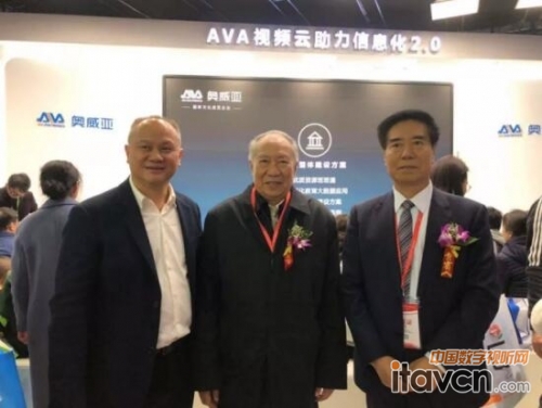 奧威亞創(chuàng)始人歐俊文(左一)與原國家教委副主任柳斌(中間)和中國教育裝備行業(yè)協(xié)會(huì)會(huì)長王富(右一)合影