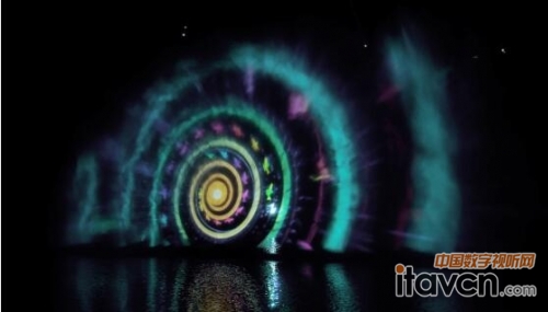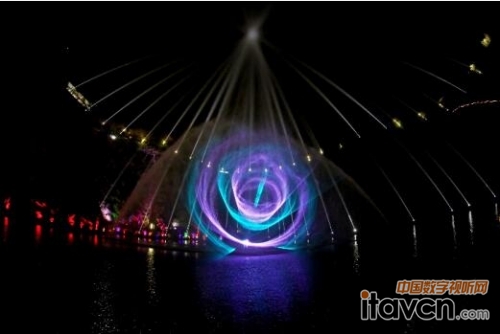 在表現(xiàn)形式中,選擇了新穎并具有極佳宣傳效果的水幕投影。所謂水幕,是通過高壓水泵和特制的水幕發(fā)生器,將水自下而上高速噴出,霧化后形成的“銀幕”,再由投影、燈光等機(jī)械設(shè)備將視頻投射在“銀幕”上,形成了水幕投影。