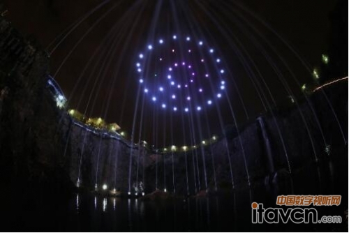 除了酒店本身的建筑亮點(diǎn),夜晚的亮化設(shè)計(jì)也極具創(chuàng)意。酒店開業(yè)當(dāng)天,燈光和無人機(jī)為其助陣。6臺31,000流明松下激光光源工程投影機(jī)打造傳奇水幕秀,在這有著天然回音結(jié)構(gòu)的環(huán)形深坑中,配合無人機(jī)燈光陣型表演,水、陸、空三維演繹回旋激蕩的創(chuàng)想藝術(shù)空間。