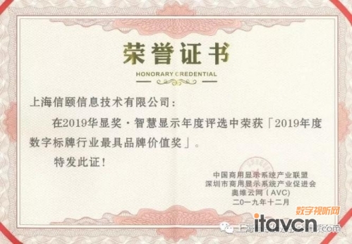 2、信頤獲 華顯獎•2019年度數字標牌行業最具品牌價值獎