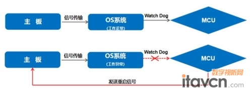 OS系統定時向MCU發送數據包來監測設備是否正常運行,若運行異常,MCU未接收到數據,則會發送重啟信號給主板。