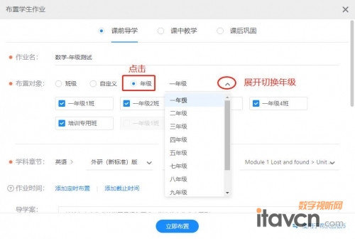 建議學校的超級管理員將年級長或者備課組長設為二級管理員,擁有管理員權限的老師,在布置的頁面上將會自動出現“年級”的選項,點擊選擇,并選擇要下發的年級。