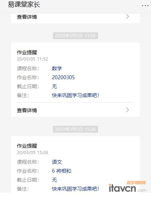 廣水市長嶺鎮(zhèn)中心小學(xué)學(xué)生家長:“關(guān)注易課堂家長公眾號就可以收到老師布置的作業(yè)提醒,非常的方便。孩子做完后還能查看具體的學(xué)習(xí)情況,對做的不好的地方可以重點輔導(dǎo),省去了很多和老師溝通的時間。”