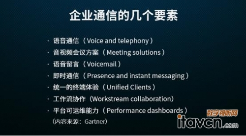國際知名調研與咨詢機構Gartner在報告里,預測了未來辦公通信的幾大要素:包括語音、視頻通信等基礎通信應用,還有統(tǒng)一的終端體驗、工作流協(xié)作等關注企業(yè)內部協(xié)同的要素,以及平臺的可運維能力等。從報告中可以發(fā)現(xiàn),通信應用走向“融合”是大勢所趨。