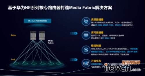 華為4KIP制播網(wǎng)解決方案采用創(chuàng)新的算法和靈活可編程的網(wǎng)絡處理器技術,提供基于IP交換矩陣的凈切換和智能識別4K/8K流幀邊界,可實現(xiàn)大規(guī)模音視頻業(yè)務高可靠調度,從而為后端播出提供高質量4K/8K視頻內容;基于Spine/Leaf的Fabric靈活極簡架構,支撐制播系統(tǒng)靈活擴容和超高清平滑演進。