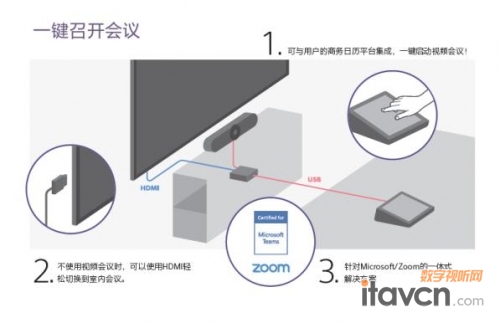 方案結合雙方產品的優勢,可提供4K顯示、日歷集成、內容即時共享、一鍵式觸摸連接等功能,可用于Zoom Rooms、Microsoft Teams。目前,有兩個配置可供選擇:用戶可選擇通過線纜連接自帶設備,開啟視頻會議;或通過觸摸屏一鍵管理會議,同時實現商務日歷平臺的集成。