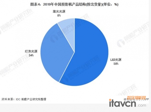 從細分市場來看,根據IDC數據,2019年LED光源投影機產品出貨量達到266萬臺,占總出貨量的58%;燈泡光源投影機產品出貨量為157萬臺,占比為34%;激光光源產品出貨量39萬臺,占比約為8%。