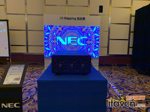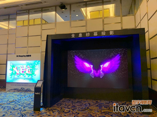 授牌儀式過后,NEC投影機產品經理張凱向大家翔實地介紹了移動式全景投影、全息紗幕投影、立體模型投影等新品解決方案,F場,醒目又炫酷的“NEC”LOGO格外吸睛,運用2萬流明英雄系列PX2000UL+ 雙色激光工程投影機,將品牌標志做出繽紛絢麗的動態效果。