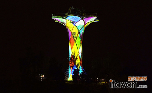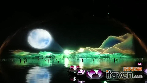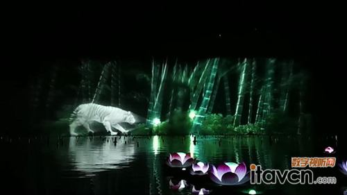 “人間仙境,盛世蓮開”的景象恰與桃花島上的標志性建筑盛世蓮花塔遙相呼應,相得益彰。夜晚的盛世蓮花塔被360°全景投影包圍,利用3D Mapping投影技術,通過21臺NEC PX1004UL激光工程投影機,分三組將炫酷立體的影像畫面躍然于上。單機10000流明高亮度勾勒出清晰輪廓,倒映在湖面上花影婆娑。