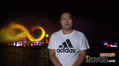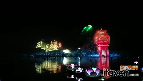開會之余,客戶一行來到依山傍水的蓮花湖風景區觀賞了5D全息水舞秀。表演以湖中噴泉噴射形成的水幕作為載體,采用2臺NEC PH3501QL+ 4萬流明雙色激光工程投影機打造出50*15米高超大水上銀幕,隨著音樂與燈光的變化起起伏伏。PH3501QL+采用紅藍雙色激光光源技術,將圖騰、蓮花、閃電等場景元素的絢爛動態影像投射到水幕上,在光怪陸離的全息光影中把蓮花湖幻化成了“人間仙境”。