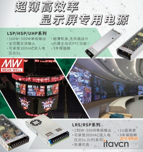 明緯向來以提供標準電源產品,以多產業應用方式規劃設計,但我們可提供顯示屏產業使用的產品也很完整,包含傳統戶外屏使用的經濟款LRS-200/350系列、一般應用的RSP-200/320系列,以及最新針對室內顯示屏應用開發的UHP-200/350(R備援)系列,提供無風扇設計等功能,讓室內屏播放時不會產生噪音及黑屏的困擾。