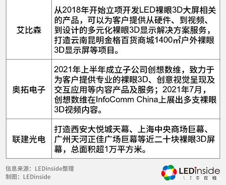 裸眼3D顯示在文化、旅游、商業(yè)、傳媒等領(lǐng)域發(fā)展如火如荼,利亞德、洲明科技、雷曼光電、艾比森、奧拓電子和聯(lián)建光電六家LED企業(yè)均積極布局。