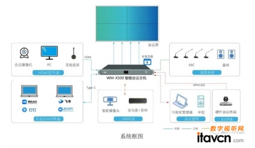 超融合一體機WM-X500,主機除對會議室音視頻實現可視化管理,同時具備與第三方視頻會議或MCU互聯互通的能力,如華為,中興,Polycom等廠家的視頻會議產品;會議室音視頻管理 + 云視頻會議無縫接合應用,WM-X500主機通過TType-C或USB連接使用騰訊/ZOOM/釘釘的平板或電腦,讓云視頻會議自由共享會議室中所有音視頻信號。