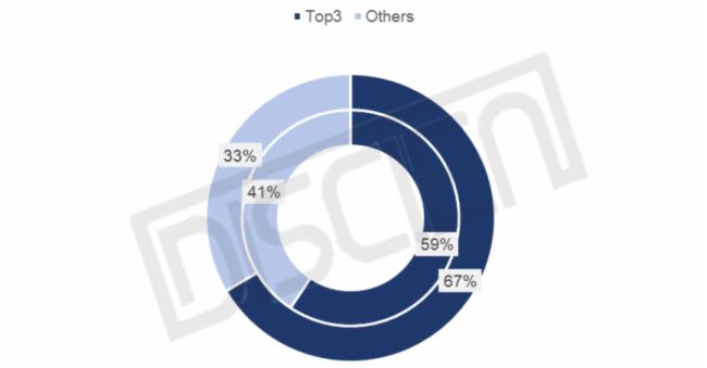 數據來源:DISCIEN,單位:%,內圈為2024H1,外圈為2025H1市場情況,Top3為TCL/海信/小米。
