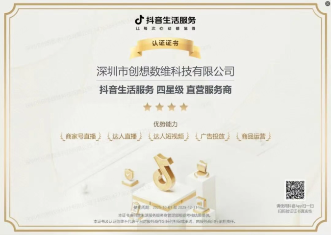 憑借扎實的技術實力與優質的服務能力,創想數維成功斬獲抖音生活服務“四星級直營服務商”認證,同時成為該平臺直播生活類目唯一技術服務商。截至目前,創想數維已服務超100家品牌客戶,打造200余個虛擬直播場景,總GMV突破億元,孵化出多個現象級直播案例,彰顯技術落地的商業價值。