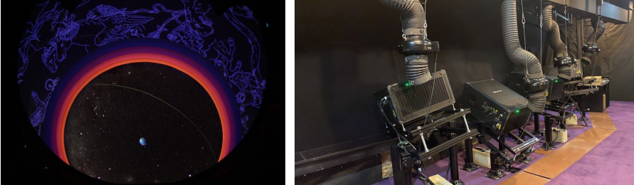 面對(duì)穹幕結(jié)構(gòu)、投影角度與散熱等技術(shù)挑戰(zhàn),進(jìn)懋與科視Christie 技術(shù)團(tuán)隊(duì)緊密協(xié)作,打造專屬冷卻氣流導(dǎo)向系統(tǒng),并進(jìn)行精密校正。最終呈現(xiàn)出更明亮、更具色彩飽和度的宇宙影像,以及低噪音、高沉浸度的觀影環(huán)境。系統(tǒng)搭載最新 Digistar 星象系統(tǒng),支持多格式播放,可進(jìn)行實(shí)時(shí)星象模擬與互動(dòng)教育展示,帶領(lǐng)觀眾跨越時(shí)空,探索宇宙奧秘。