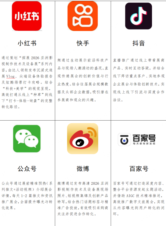 在現(xiàn)有新媒體矩陣基礎(chǔ)上,可重點(diǎn)開拓行業(yè)垂直渠道進(jìn)行深度滲透:聯(lián)合B站、虎嗅、36氪等科技與創(chuàng)意內(nèi)容平臺(tái),打造“技術(shù)公開課”系列直播,由擬邀展商技術(shù)專家解析AIGC生成、虛擬制片等實(shí)戰(zhàn)案例;接入行業(yè)KOL的線下工作室探訪及設(shè)備測(cè)評(píng)內(nèi)容,實(shí)現(xiàn)從技術(shù)理論到應(yīng)用場(chǎng)景的深度種草;同時(shí)與影視工業(yè)網(wǎng)、游戲葡萄等垂直媒體合作建立展會(huì)專題頁(yè),嵌入預(yù)約系統(tǒng),并定向觸達(dá)其數(shù)據(jù)庫(kù)中的制作公司、工作室等核心從業(yè)者,完成精準(zhǔn)引流。