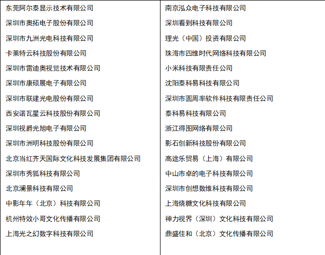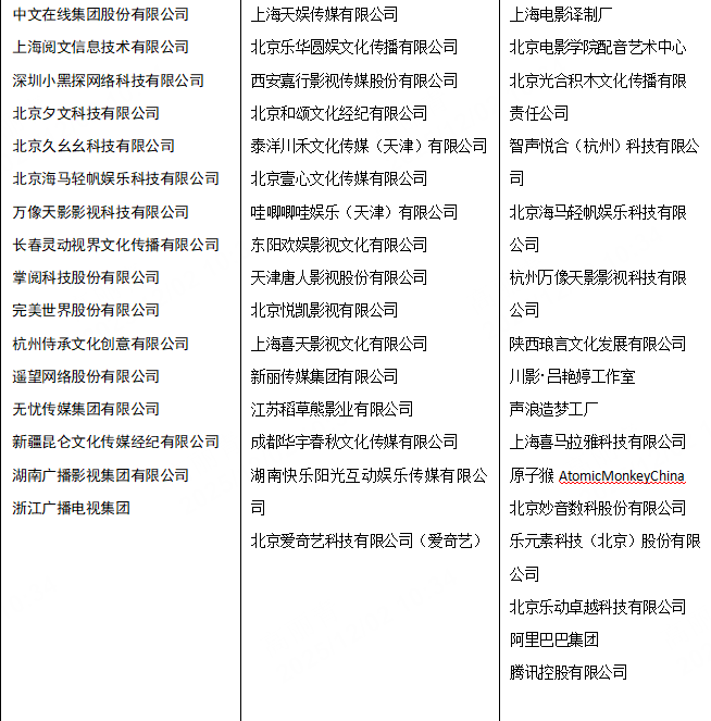 完美世界股份有限公司 萬像天影影視科技有限公司 北京愛奇藝科技有限公司 天津貓眼微影文化傳媒有限公司 思美傳媒股份有限公司 浙文影業(yè)集團(tuán)股份有限公司 湖南電廣傳媒股份有限公司 北京捷成世紀(jì)科技股份有限公司 中南紅文化集團(tuán)股份有限公司 浙江東望時(shí)代科技股份有限公司 華夏電影發(fā)行有限責(zé)任公司 北京京西文化旅游股份有限公司 阿里巴巴影業(yè)集團(tuán)有限公司 北京字節(jié)跳動(dòng)網(wǎng)絡(luò)技術(shù)有限公司 追光人動(dòng)畫設(shè)計(jì)(北京)有限公司 北京壞猴子文化產(chǎn)業(yè)發(fā)展有限公司