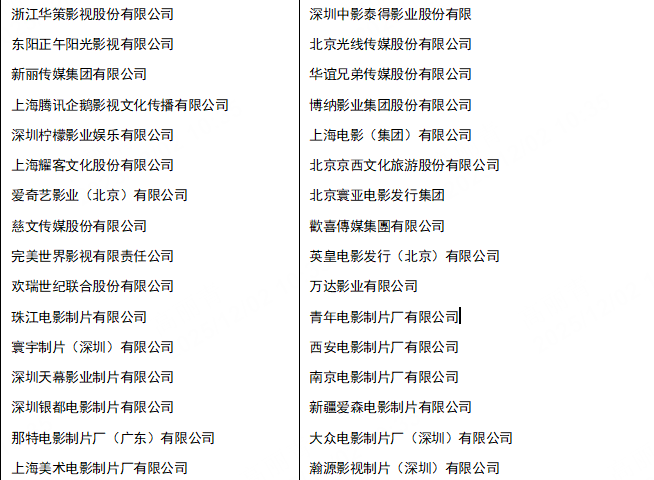 騰訊影業(yè)文化傳播有限公司 北京開心麻花娛樂文化傳媒股份有限公司 北京五元文化傳媒有限公司 東陽(yáng)留白影視文化有限公司 深圳市普樂方數(shù)字電影有限公司 中影數(shù)字電影發(fā)展(北京)有限公司 橫店影視股份有限公司 上海天涌影視傳媒股份有限公司 重慶萌梓影視傳媒股份有限公司 長(zhǎng)城影視股份有限公司 蘇州傳視影視股份有限公司 上海喜天影視文化有限公司 北京星光影視設(shè)備科技股份有限公司 天津唐人影視股份有限公司 北京領(lǐng)驥影視文化股份有限公司 星座魔山影視傳媒股份有限公司 |
