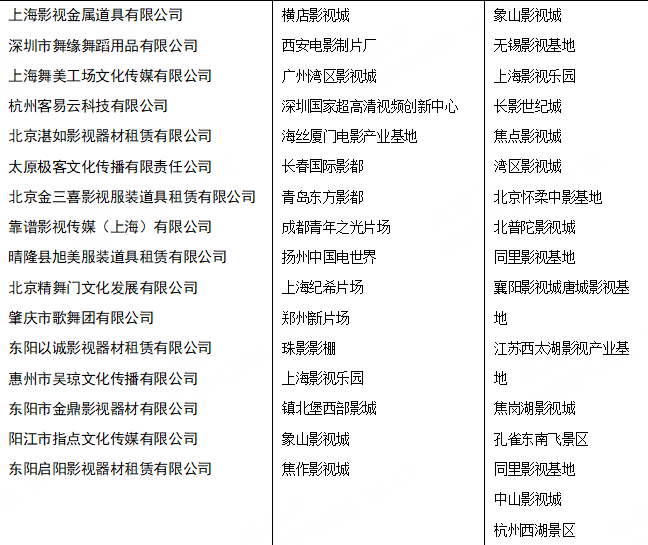 影視基地:橫店影視城、西安電影制片廠、廣州灣區(qū)影視城、深圳國(guó)家超高清視頻創(chuàng)新中心、海絲廈門電影產(chǎn)業(yè)基地、長(zhǎng)春國(guó)際影都、青島東方影都、成都青年之光片場(chǎng)、揚(yáng)州中國(guó)電世界、上海紀(jì)希片場(chǎng)、鄭州新片場(chǎng)、珠影影棚、上海影視樂園、鎮(zhèn)北堡西部影城、象山影視城、焦作影視城