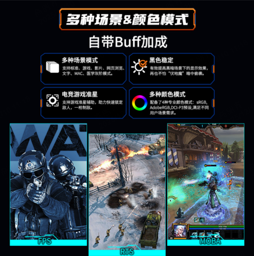 VX27G58-2K-10內(nèi)置五向OSD搖桿按鍵,操作更直觀,切換模式更高效。除此之外,它還配備電競(jìng)游戲準(zhǔn)星功能和黑色穩(wěn)定技術(shù),可提升玩家的操作體驗(yàn)及畫面的暗部細(xì)節(jié);其內(nèi)置的多種游戲模式(FPS、RTS、MOBA),玩家可根據(jù)場(chǎng)景快速切換,獲得更契合的視覺(jué)體驗(yàn)。