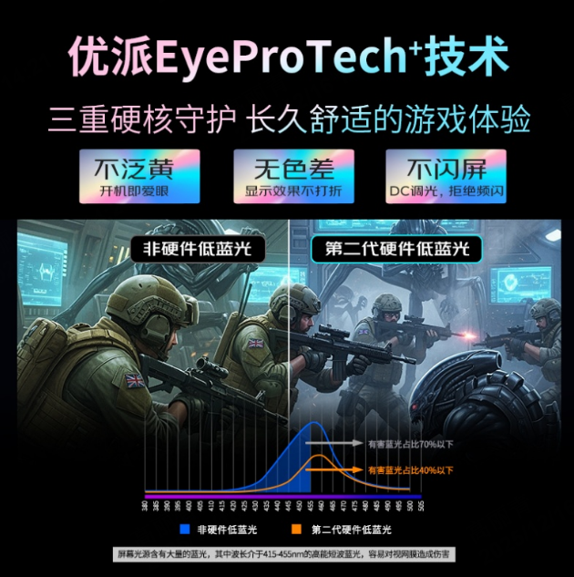 對于電競玩家來說,長時間的游戲更需要關注視力防護,避免眼部疲勞影響體驗和健康。VX27G58-2K-2搭載Eye ProTech+護眼方案,結合第二代硬件級低藍光與不閃屏DC調光,帶來不泛黃、無色差、不閃屏的顯示效果,為電競玩家的視覺健康保駕護航。