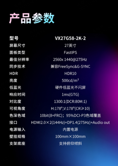 接口方面,VX27G58-2K-2配備雙HDMI 2.0接口、DP接口及音頻輸出,支持多設備接入,滿足主機、PC與多媒體設備的多樣化需求。背部支持100mm*100mm壁掛安裝,適配多種桌面布局,讓你的電競空間更自由。采用內置電源設計,無需額外外接電源適配器,大幅簡化桌面布線,告別雜亂線材堆積,讓桌面更整潔利落;同時搭配金屬超薄底座減少占用空間,適配各類緊湊桌面布局,兼顧美觀與實用性。